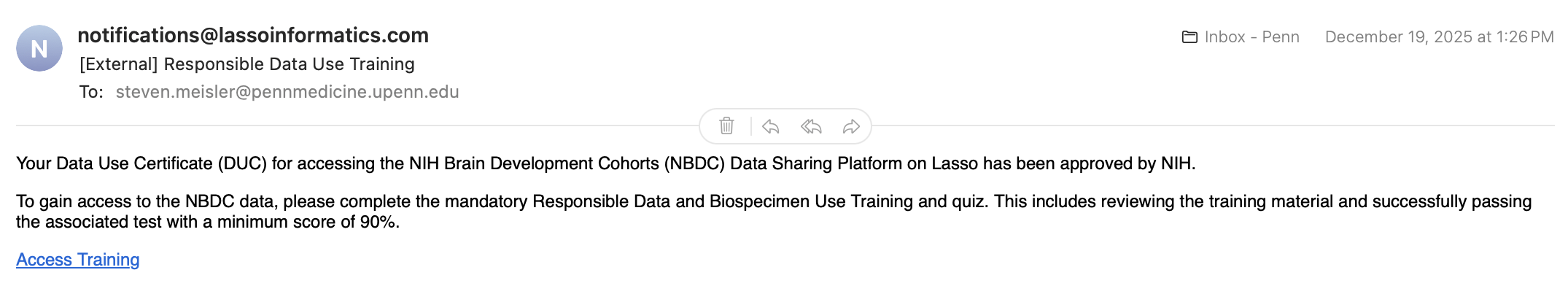 If you are on a group DUC (e.g. your lab PI submitted it), both you and your PI (whoever is listed as the lead person on the DUC) must complete the post-DUC training modules.