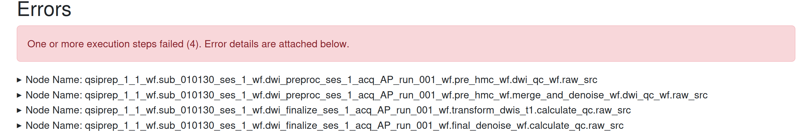 I’m testing out the latest version of QSIPrep : 1.1.1. I’m testing it out on a subject that I had previously ran with version 1.0.2, which was successful. After it finished processing, I checked the HTML file. Everything looked good except for the fact that it reported 4 errors at the end (screenshot provided). I looked through the errors and they’re all related to dsi_studio and version `GLIBC_2.38’ not being found. Because of this error, what isn’t being executed? Some qc metric? Is there a way to resolve this? I don’t know how necessary it is to resolve this though, because from a quick glance at my file directory it looks like all the important outputs are there (e.g., DWI, b0 ref, T1w, etc.)