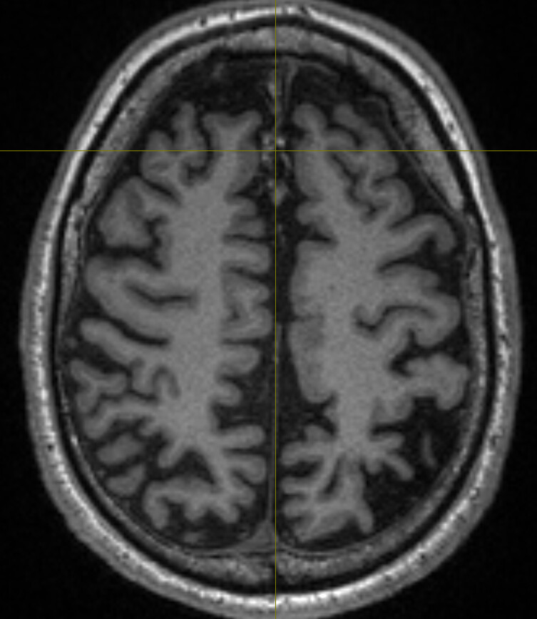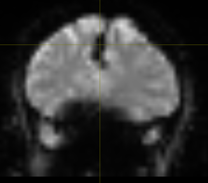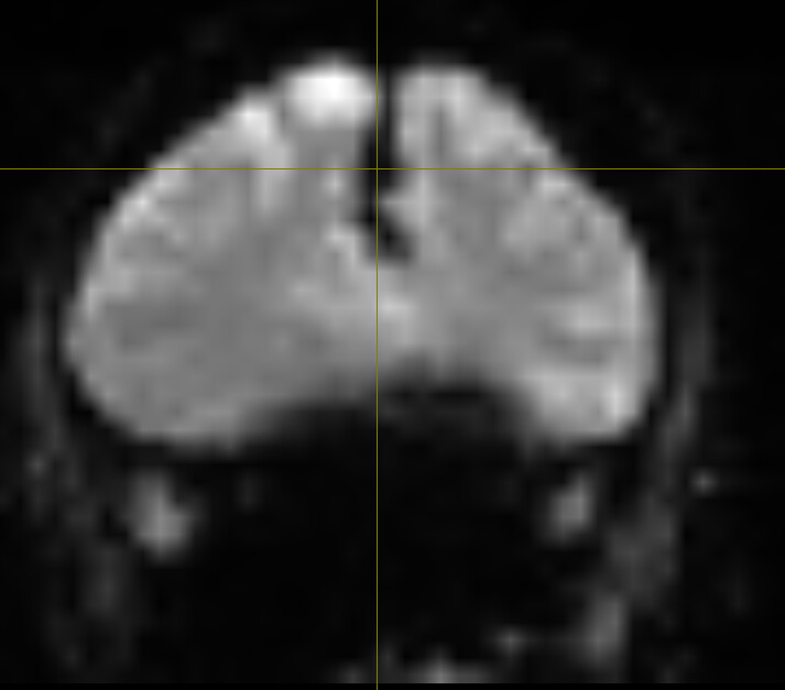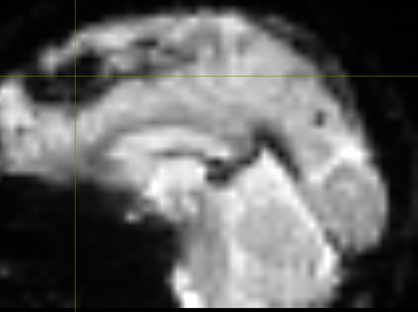 Upon further inspection, I noticed a midline “something” in the anatomical scan (below, anomaly marked by crosshair) extending several slices: