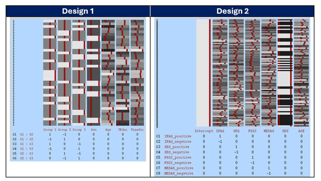In both designs, I model sex as one EV coded 0/1 for the two categories and then demeaned across subjects. All other covariates are continuous and also demeaned.