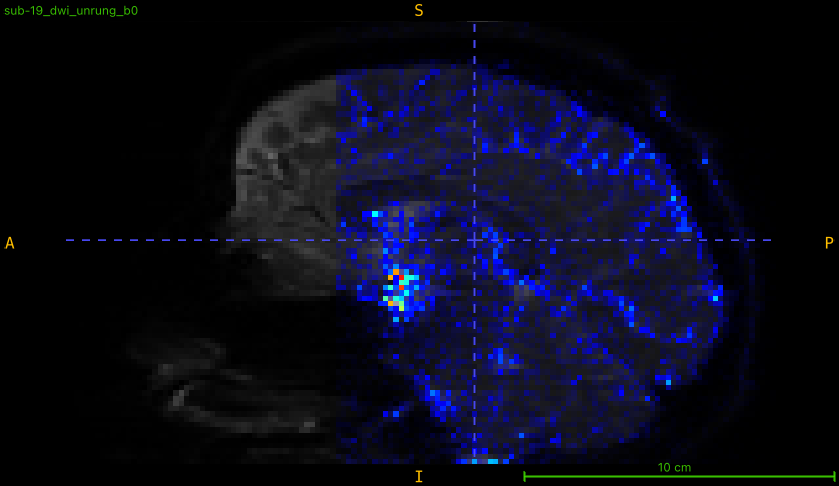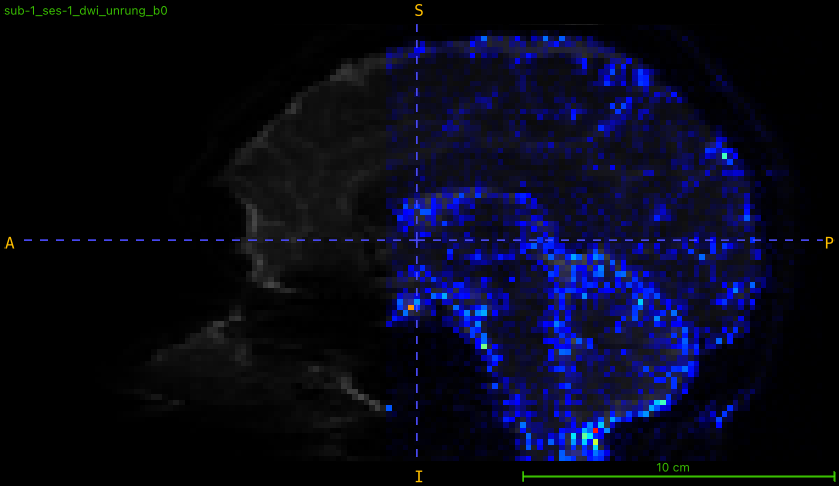 It switched! Now the cutoff is a bit more rostral along the PE axis and it’s just the posterior portion of the brain that seems to have estimated/removed Gibbs artifacts. Here’s an example from a cs-DSI collected in May of this year (absolute value overlaid after subtracting the first raw and unrung b=0 volume):