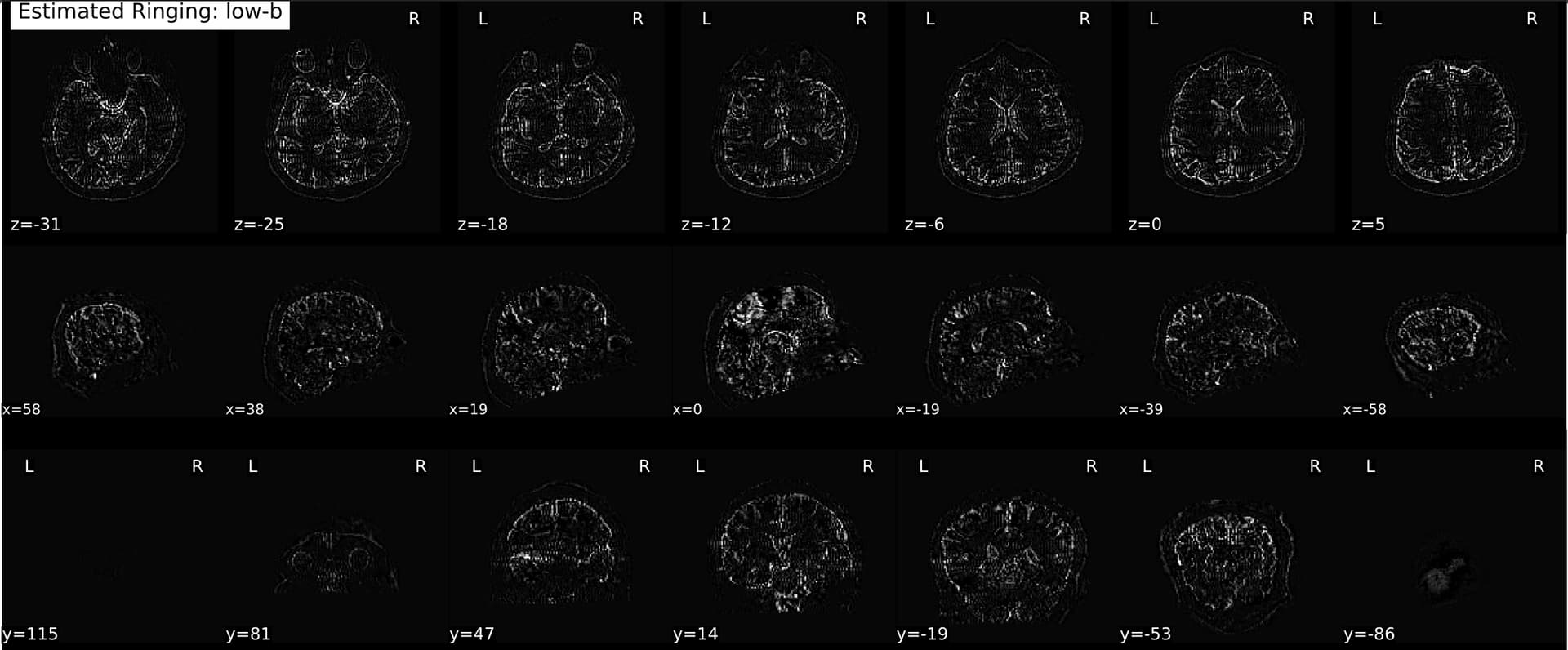 I’ve been processing data for a few different studies using a couple different DSI sequences, two with a multiband Q4 sampling scheme and one multiband cs-DSI—both of which I know @mattcieslak is familiar with (sorry to bother you, Matt). We’ve been noticing that the Gibbs-unringing step in every subject produces some curious outputs: namely, the estimated Gibbs artifacts only appear on the front half of the brain—and I really do mean that literally, insofar as there is a sharp cutoff right at the midpoint of the brain along the phase-encoding axis (see images below).