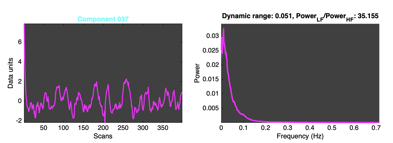 I then proceeded to run a Group ICA, however most of my components have these large jumps at the start of the time courses (see image) along with large PowerLF/PowerHF values.