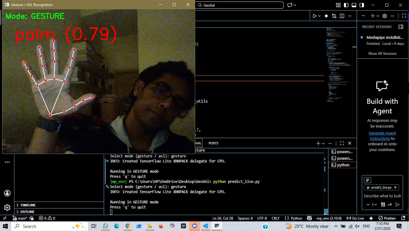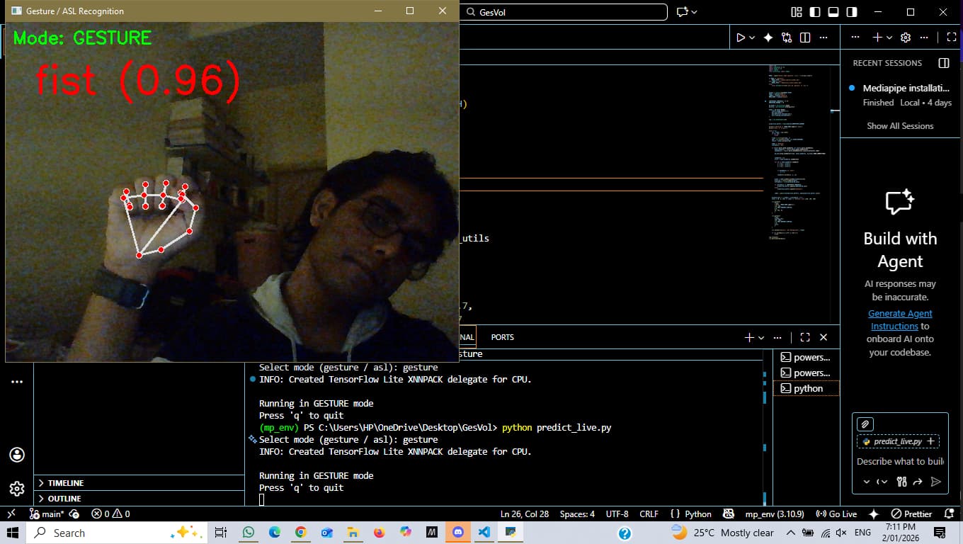 I focused on building a clean and controlled pipeline rather than optimizing for scale. The system uses landmark normalization relative to the wrist, left/right hand mirroring, confidence-based rejection for unknown gestures, and temporal smoothing to stabilize live predictions.