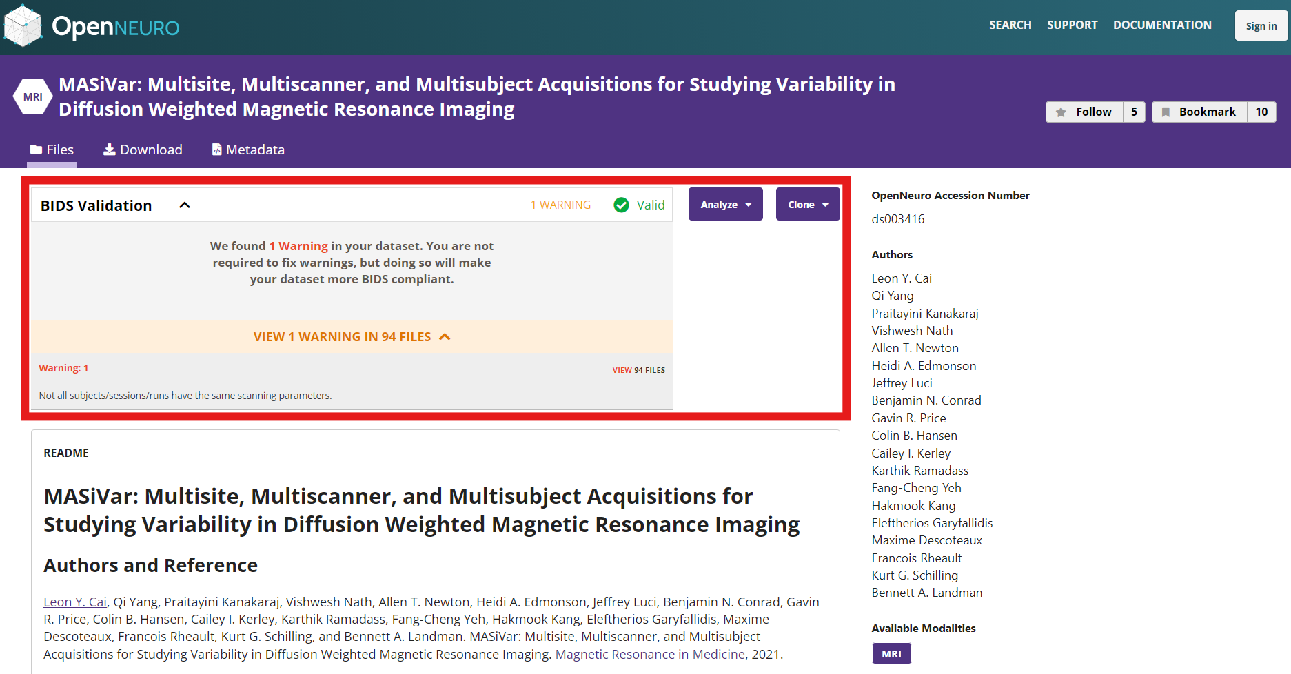 I ran the official BIDS validator (v2.2.3) on the MASiVar dataset (OpenNeuro ds003416) and got a large number of errors of the form: