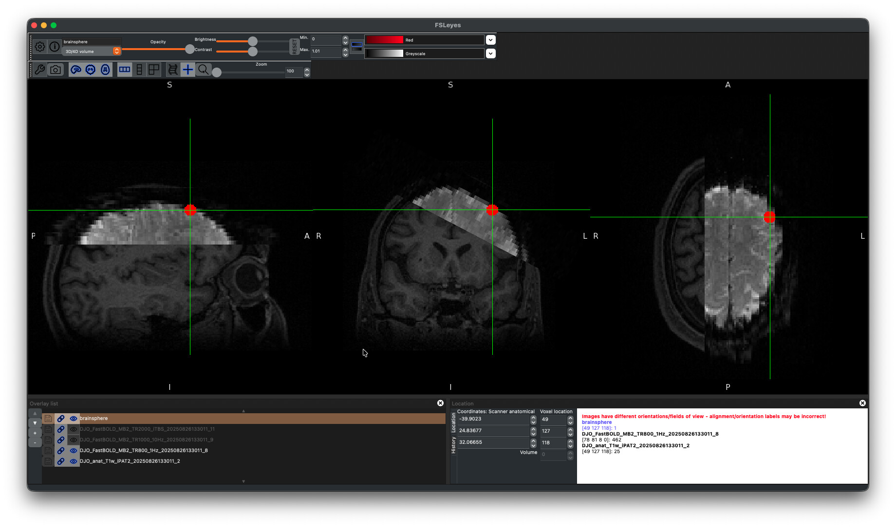 I ran an experiment to attempt to measure potential BOLD response to TMS at the site of stimulation. To optimize spatial resolution, we used an acquisition FOV limited to the region of interest, obliqued to cover just the scalp and a few inches into the brain underneath the TMS coil.