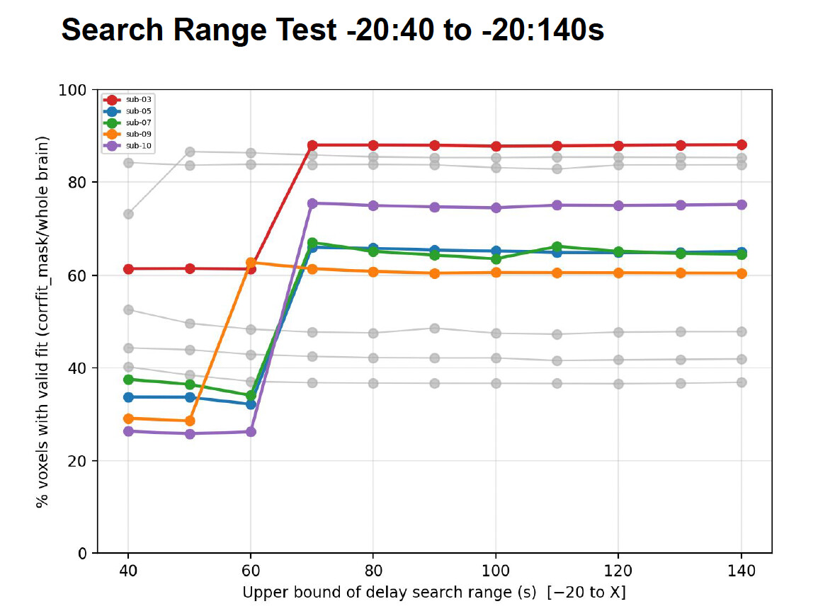 What I tested: I re-ran this command, expanding only the upper limit of the search range, from -20:40 all the way to -20:140s. I then plotted the % of voxels that were determined to have a “valid fit” (corrfit_mask/brainmask) across each search-range window.