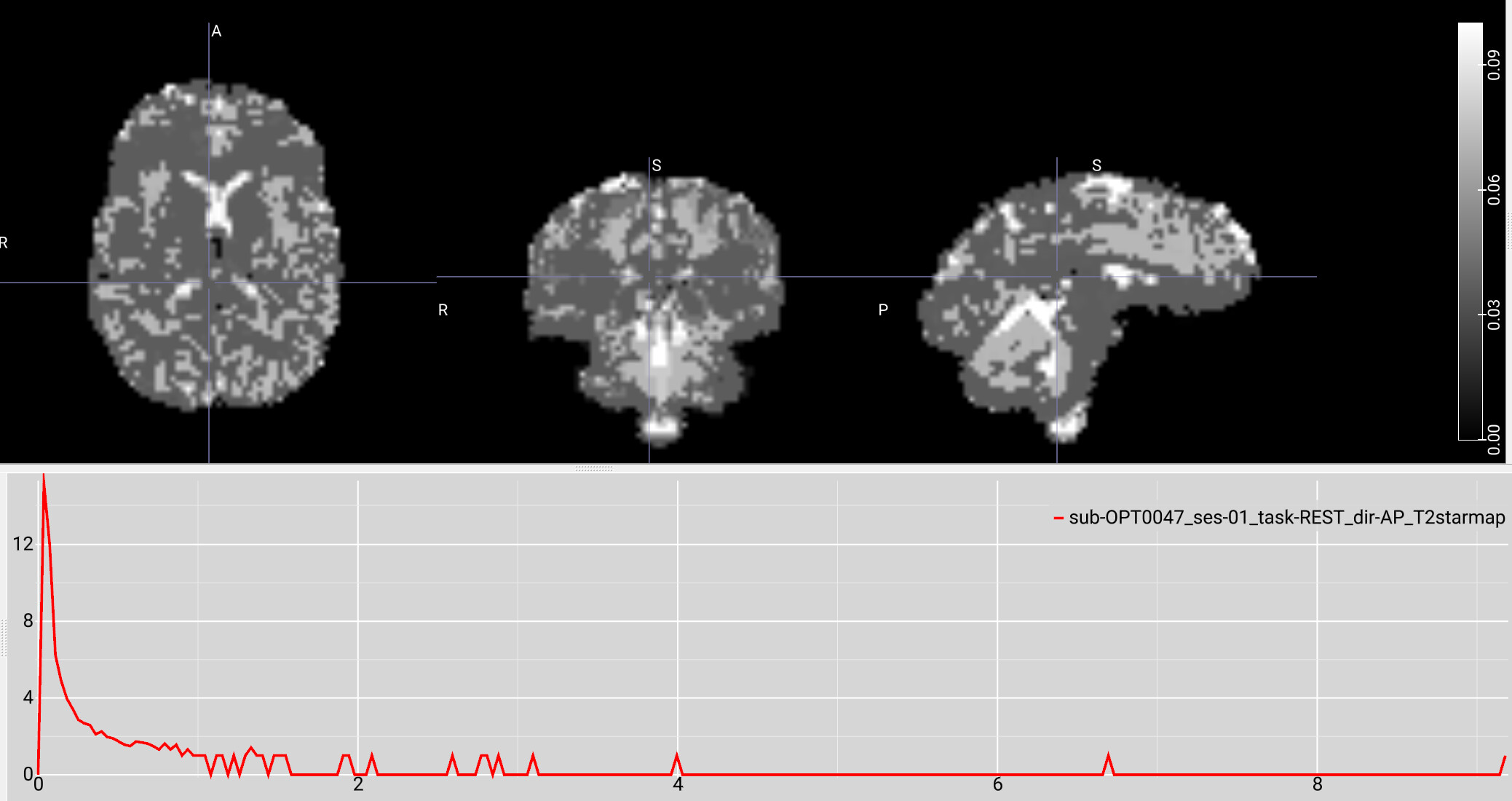 Example screenshot of a T2* map created with tedana 24.0.1 with a max voxel value under 1: