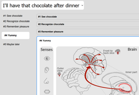 Today, there is just one sequence available: “I’ll have that chocolate after dinner”, featuring the eye, the optic nerve, the optic chasm, the cuneus, the inferior temporal gyrus, the hippocampus, the Ventral tegmental area, and the frontal pole.